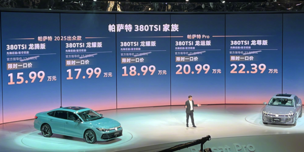【CNMO科技消息】9月10日晚,上汽大众召开了新车发布会,此次发布会的重点则是大众帕萨特380家族,新车包含2025出众款和Pro版两款车型共5个配置,售价17.69万-23.99万元,限时一口价15.99万-22.39万元。