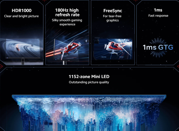 尤为引人注目的是G Pro 27i采用的Mini LED背光技术,该技术配备了1152个局部调光区域,使得显示器能够轻松达到1000尼特的峰值HDR亮度,并获得VESA DisplayHDR 1000认证。