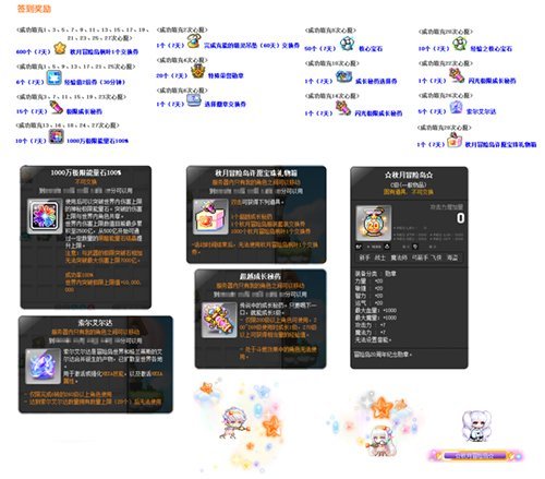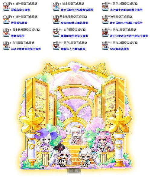 完成各个图鉴时,可以获得特殊宝物;完成所有图鉴还可以获得秋月冒险岛回忆椅(180天权)