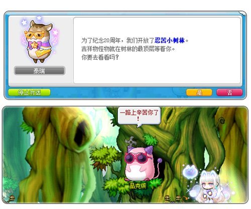 9月11日起至9月24日,在秋月冒险岛地图找到NPC泰瑞接取[冒险岛勇士任务]忍苦小森林任务,和泰瑞对话移动到忍苦小森林,选择喜欢的吉祥物怪物并投票,到达最上方和所选吉祥物怪物对话,就可以获得特别的礼物!