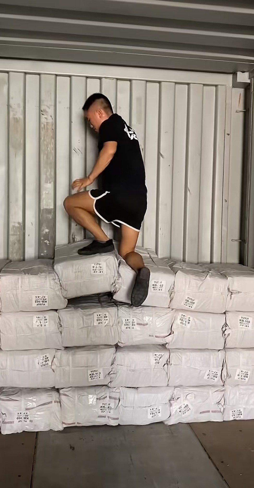 手肘推、膝盖击、再用脚踹,一件件货物在小伙“搓圆捏扁”下,紧密排列在一起。