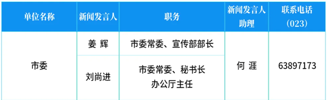 名单显示,重庆市委的新闻发言人有两位,一位是重庆市委常委、宣传部部长姜辉,另一位是重庆市委常委、秘书长、办公厅主任刘尚进。