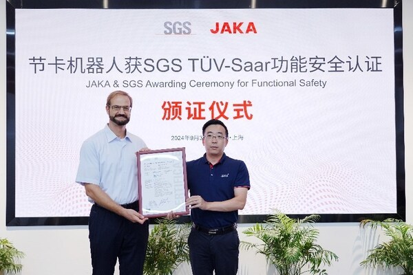 上海2024年9月12日 /美通社/ -- 近日,SGS授予节卡协作机器人全球市场准入认证证书。SGS全球产品认证首席签证官Mark Lohmann、中国区功能安全中心产品线总监郑峥,节卡机器人CTO许雄、首席质量官吴为、产品技术专家邓江海等,共同出席与见证此次颁证。