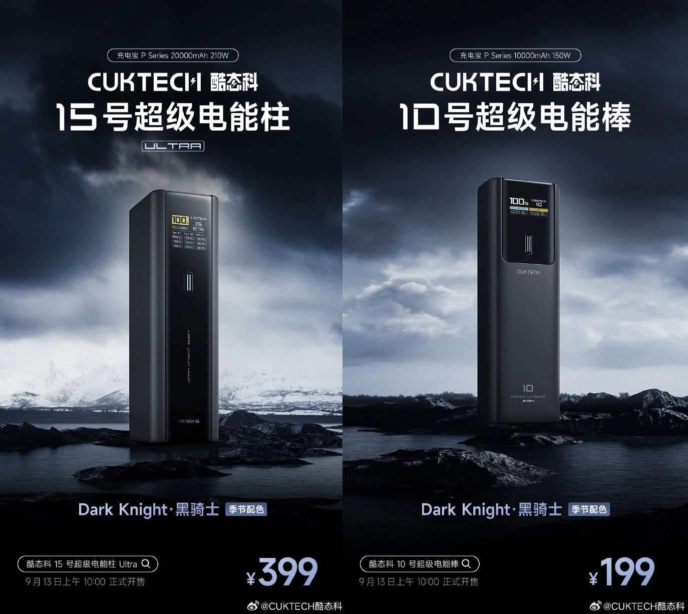 9 月 12 日消息,酷态科官宣,10 号超级电能棒和 15 号超级电能柱Ultra,新增 Dark Knight · 黑骑士「季节配色」,于明日开售。