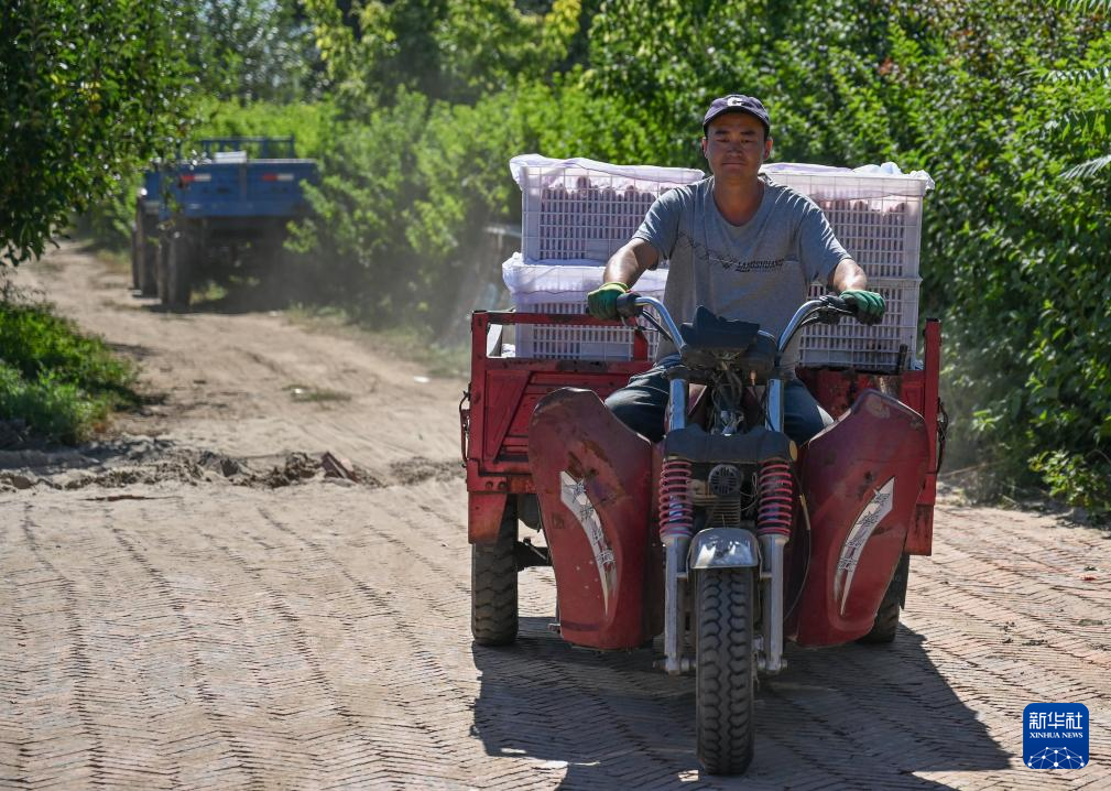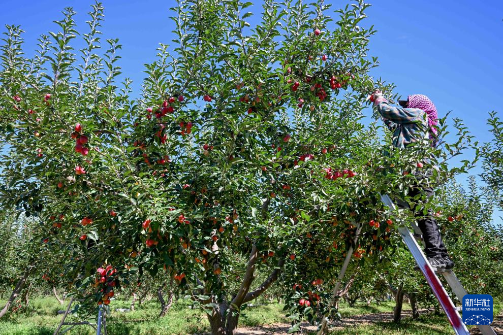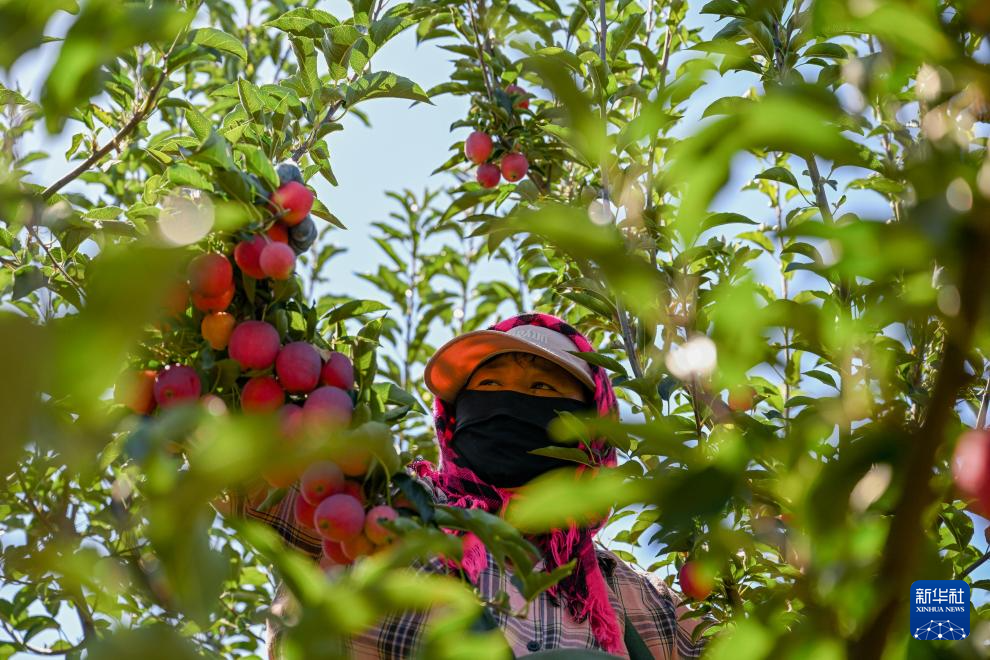 9月12日,在通辽市科尔沁左翼中旗希伯花镇希伯花嘎查,果农在采摘锦绣海棠果。