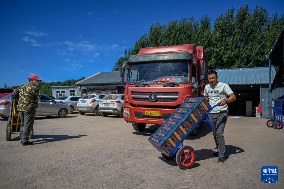 9月12日,在通辽市科尔沁左翼中旗希伯花镇希伯花嘎查,工人们在装运锦绣海棠果。