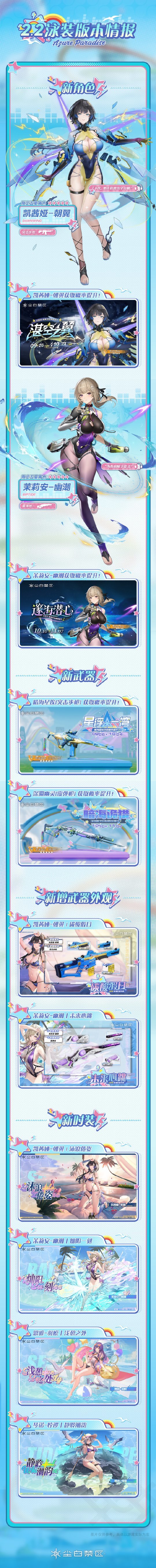 9月12日消息,《尘白禁区》官方在今日发布了2.2版本“碧水假日”的最新情报。在本次新版本中加入两位限定五星新角色“凯茜娅-朝翼”、“茉莉安-幽潮”以及多款喜闻乐见的泳装皮肤等。