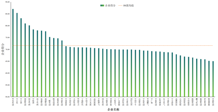 50家入榜企业得分区间分布上,71.63 分以上分值区间的企业有 13 家,其中得分在 80 分以上的企业仅有 5 家企业;(70,71.63分值区间的企业共有 13 家,[60,70]分值区间的企业共有 24 家。这种分布表明,尽管部分企业在碳中和行动方面已经取得了优异的成果,但基于“碳达峰、碳中和”目标的实现,还处在平稳推进的过程,仍存在着进一步改进和提升的空间。