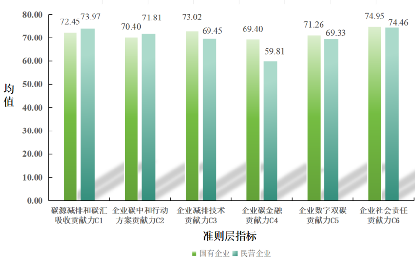 可以看出,国有企业在“C3-C6”四个准则层均值得分均高于民营企业,“企业碳金融贡献力C4”均值得分上明显高于民营企业,主要原因在于大部分纳入全国碳市场的能源企业为传统能源企业,且以央国企居多,对碳资产、碳金融的联系紧密程度比民企要高,且布局较早。民营企业在“企业碳中和行动方案贡献力C2”上,优于国有企业。一方面,民营企业基于可持续发展理念,通过尽早制定碳达峰碳中和行动方案,以推动业务模式和运营方式的绿色转型;另一方面,基于投融资和市场需求,越来越多的投资者和采购商倾向于支持有明确气候行动计划和目标、并已开展相关降碳行动的企业;最后,基于增强企业市场竞争优势、提升品牌形象的需要,展现企业对环境责任的承担,吸引更多关注可持续发展的消费者和合作伙伴。