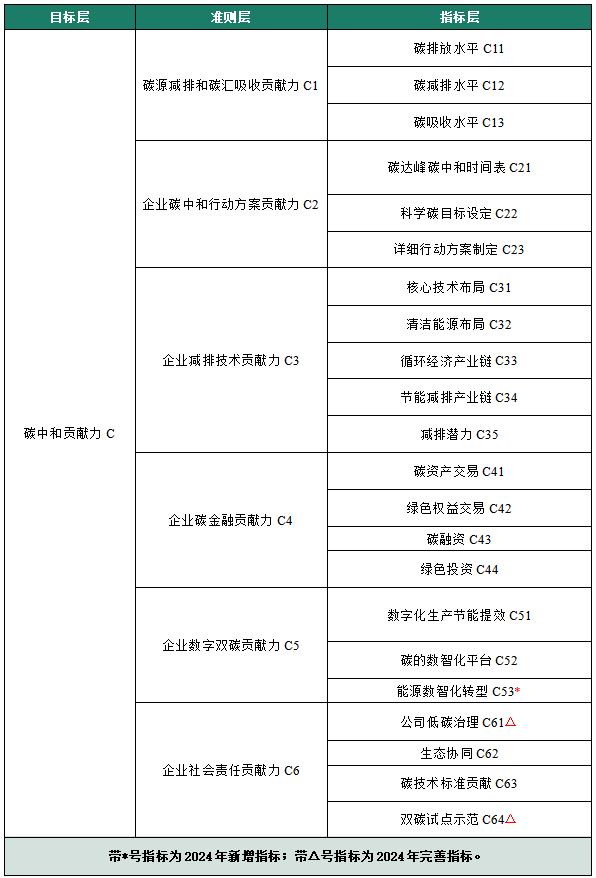 为确保碳中和贡献力评价工作的延续性和一致性,研究团队继续采用层次分析评价模型评估企业碳中和贡献力,与2021—2023年度《报告》保持一致。中国能源企业碳中和贡献力评价指标体系准则层,从六个维度进行评价。