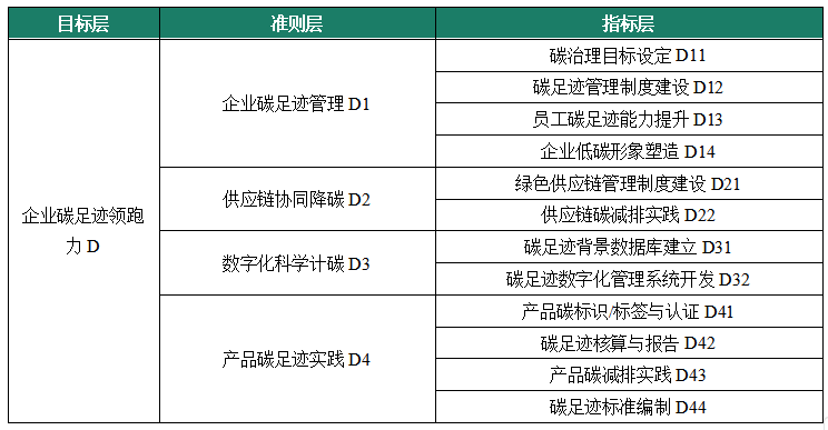 为确保评价指标体系设置的合理性,以《关于建立碳足迹管理体系的实施方案》为纲领性文件,结合国内外最新的碳足迹政策及标准,构建包含四大准则层和十二项指标层的碳足迹领跑力评分框架,以实现对样本企业碳足迹工作的公平、公开、公正评价。