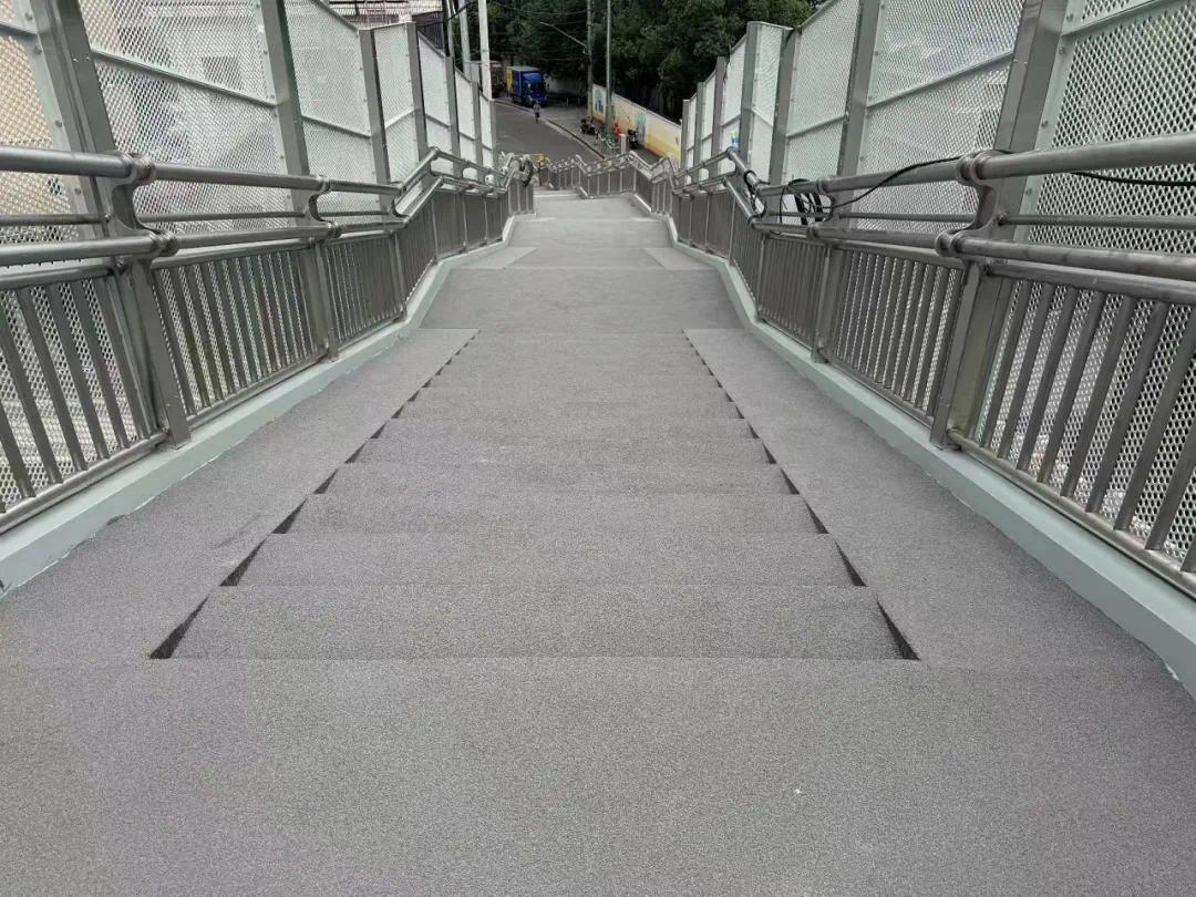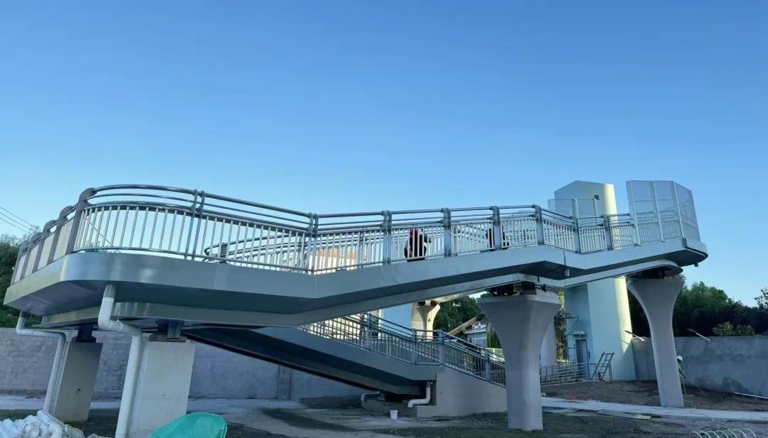 据施工方介绍,三门路跨线天桥全长约126米,总宽3.5米,桥面通行净宽3.2米,设置人行和非机动车推行道,两侧各配置一部无障碍电梯。