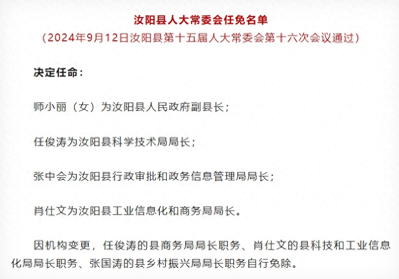 因机构变更,任俊涛的县商务局局长职务、肖仕文的县科技和工业信息化局局长职务、张国涛的县乡村振兴局局长职务自行免除。