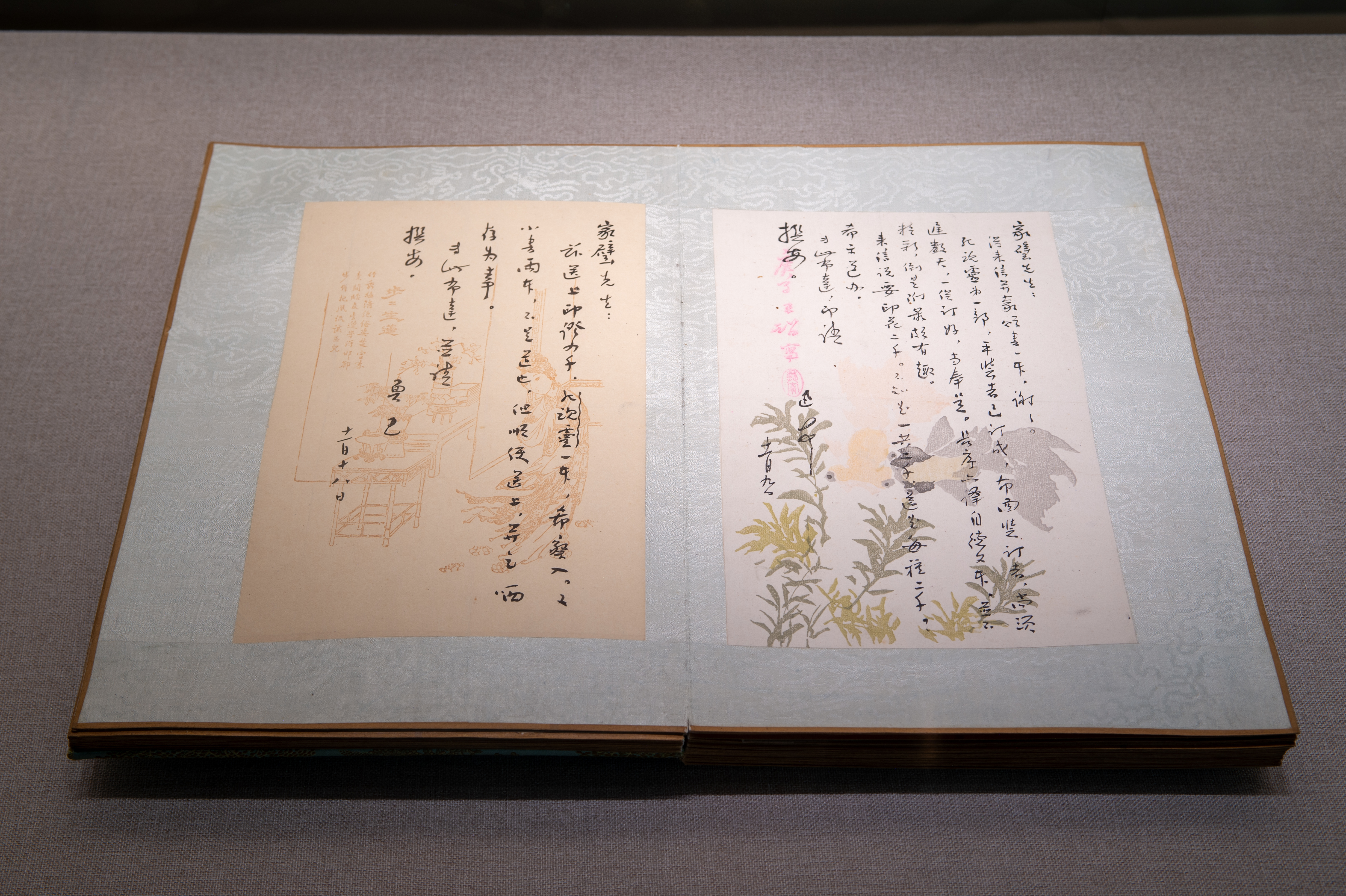 现场展出的一本鲁迅致赵家璧信为一级文物,共45封信,时间始于1933年1月8日,终于1936年10月12日。赵家璧,良友图书公司编辑,致力于左翼文化书籍的出版。鲁迅向良友公司提供自译书稿两部,为良友选编书稿三册,为良友推荐介绍左翼作家创作集三本,译作二种。围绕这十种书的编辑出版,鲁迅和赵家璧进行了频繁的通信。这批信件大多数用了精美的笺纸书写。赵家璧将鲁迅的45封信精装成册,册页板上裱以仿古锦,装入木匣中加以珍藏,于上世纪70年代捐赠给上海鲁迅纪念馆。