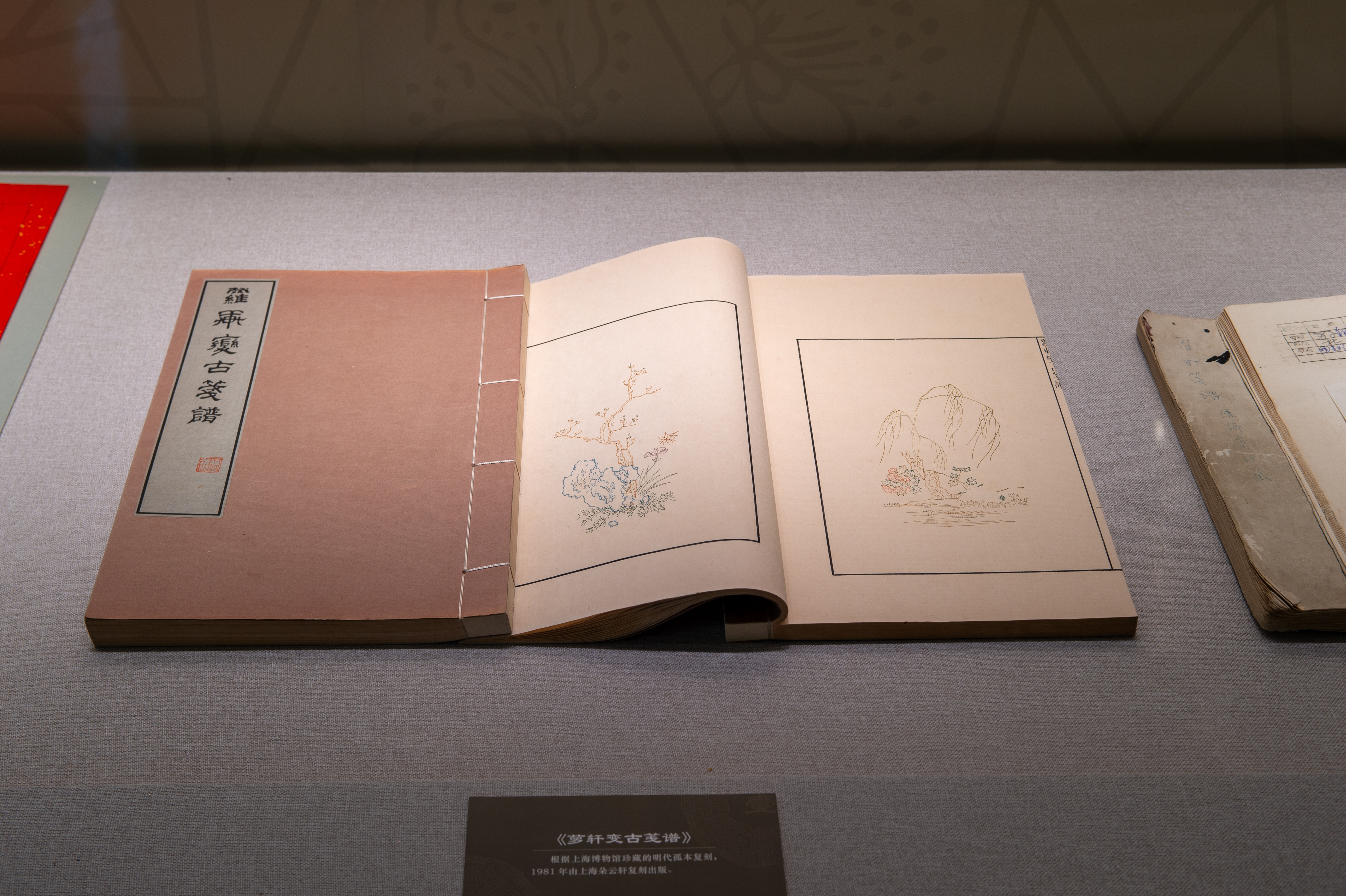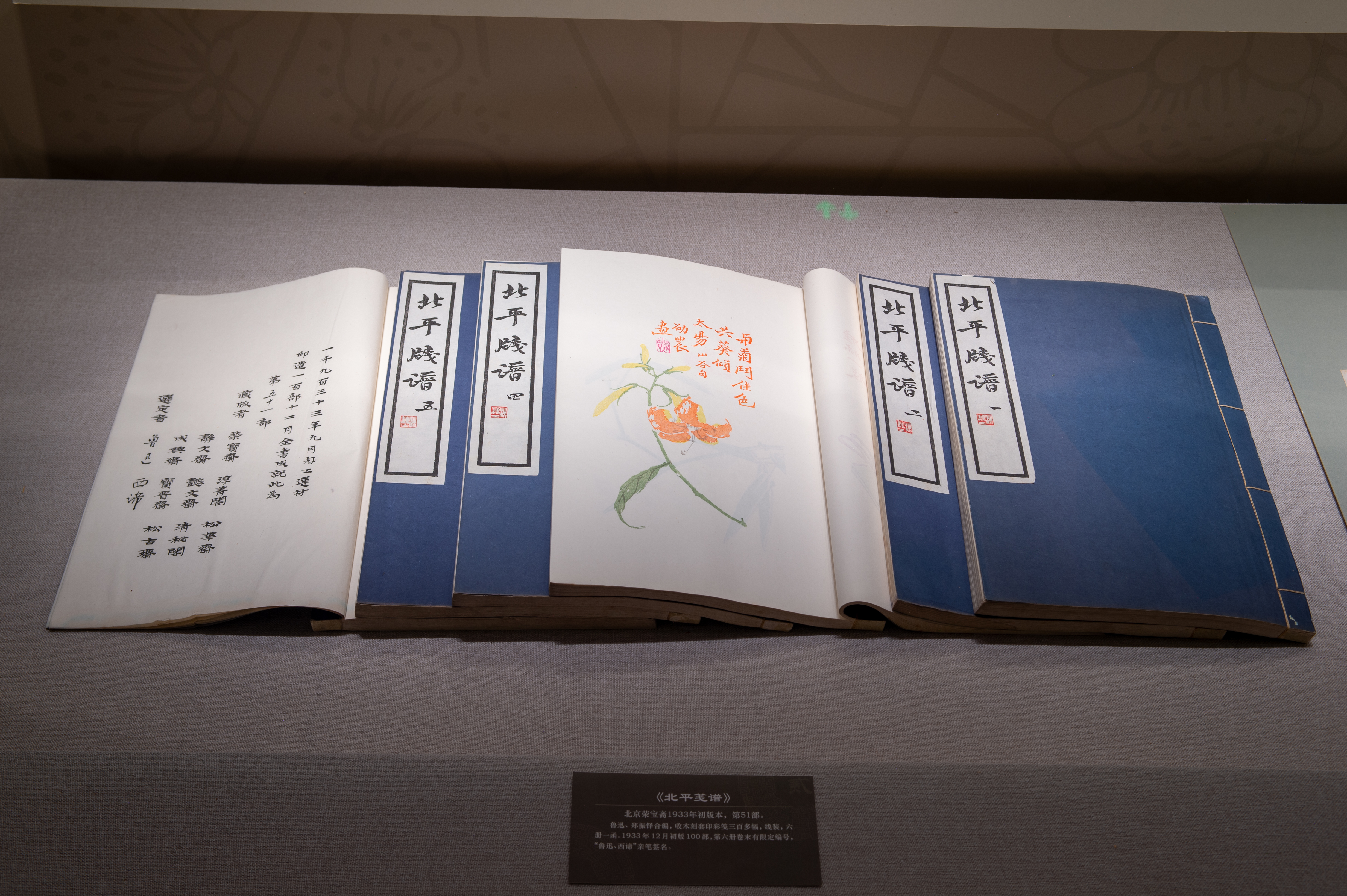 同场陈列的北京荣宝斋1934年12月版《十竹斋笺谱》,则由鲁迅和郑振铎以“版画丛刊会”的名义翻印,鲁迅生前只印出一卷,其余各卷直至1941年7月才全部印成。