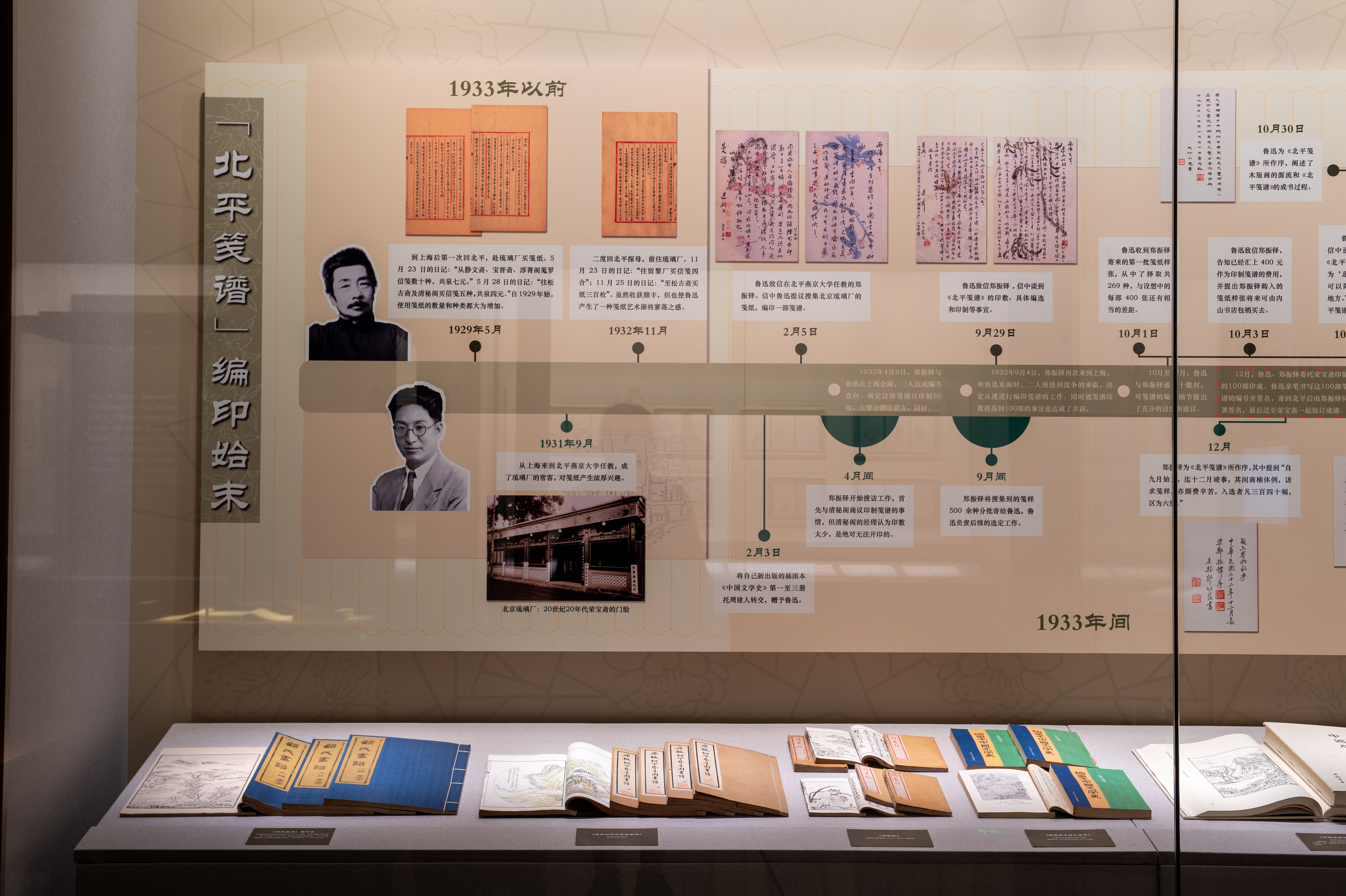 有感于笺纸出现了衰落的趋势,鲁迅萌生了搜集笺纸、刻印成书的念头。本次展览在第二板块系统梳理出《北平笺谱》编印始末:1933年2月5日,鲁迅致信在北平燕京大学任教的郑振铎,信中鲁迅提议搜集北京琉璃厂的笺纸,编印一部笺谱。4月6日,郑振铎与鲁迅在上海会面,二人达成编书意向。商定这部笺谱只印制50部,主要分赠给朋友、同好。郑振铎开始搜访工作,首先与清秘阁商议印制笺谱的事情,但清秘阁的经理认为印数太少,是绝对无法开印的。9月4日,郑振锋再次来到上海,和鲁迅见面时,二人预感到战争的来临,决定从速进行编印笺谱的工作。同时就笺谱印数提高到100部的事宜也达成了共识。10月至12月,鲁迅与郑振铎通信十数封,对笺谱的编印细节提出了充分的设想和建议。12月,鲁迅、郑振铎委托荣宝斋印制的100部印成。初版第六册卷末有编号,有两人亲笔签名。出版后鲁迅发现缺了5种笺纸,在信中列出,希望再版补入。1934年3月中旬,第二版《北平笺谱》仍委托荣宝斋印100部,收录包括陈师曾、齐白石、吴待秋、陈半丁、至梦白、金城等画坛大家的画笺,最大限度地保存了20世纪初笺纸的面貌。本次展览展出了初版100部中的第51部和再版本的第40部。