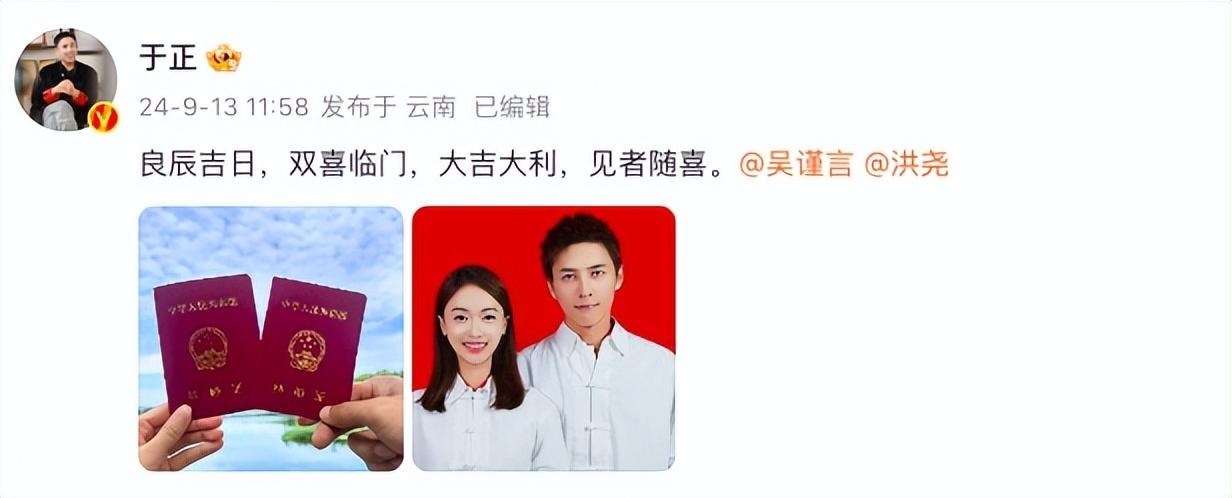 对此,于正发文祝福:“良辰吉日,双喜临门,大吉大利,见者随喜。”