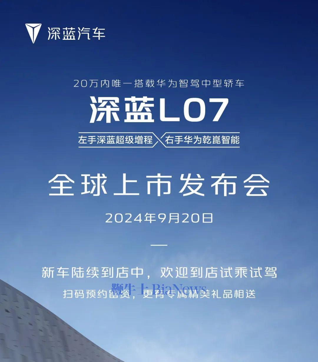 鞭牛士 9月13日消息,深蓝汽车今日官宣,深蓝L07将于9月20日上市发布,该车号称“20万内,唯一搭载华为乾崑智驾的中型轿车”。