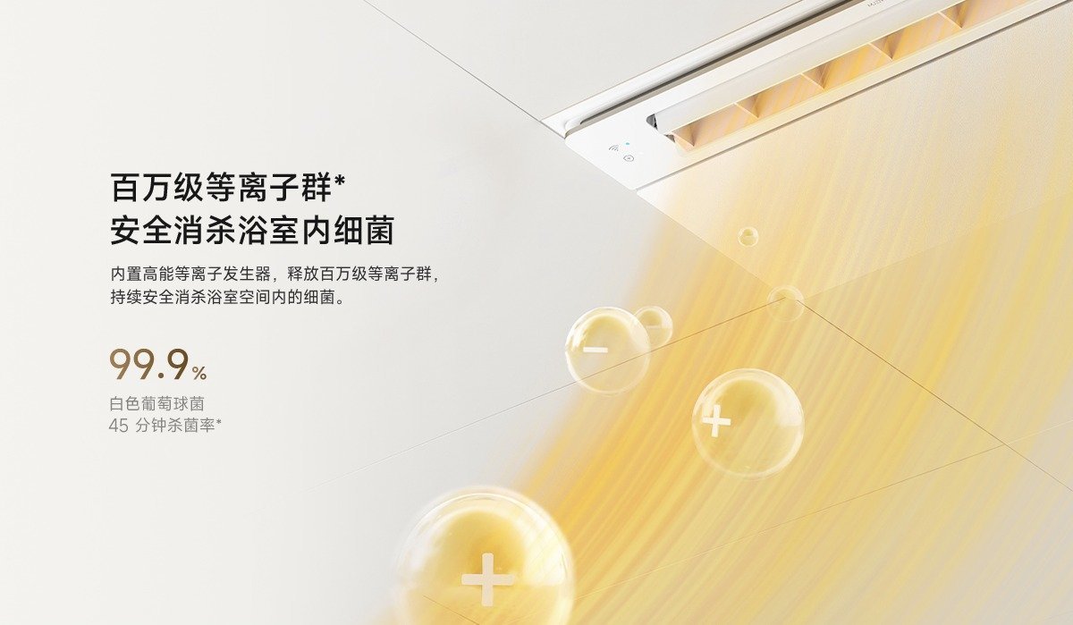 对卫生安全,米家智能浴霸 N1 也有一手。它内置了高能等离子发生器,能释放百万级等离子群,能持续安全消杀浴室空间内的细菌,其中,在 45 分钟内对白色葡萄球菌的杀菌率能高达 99.9%。
