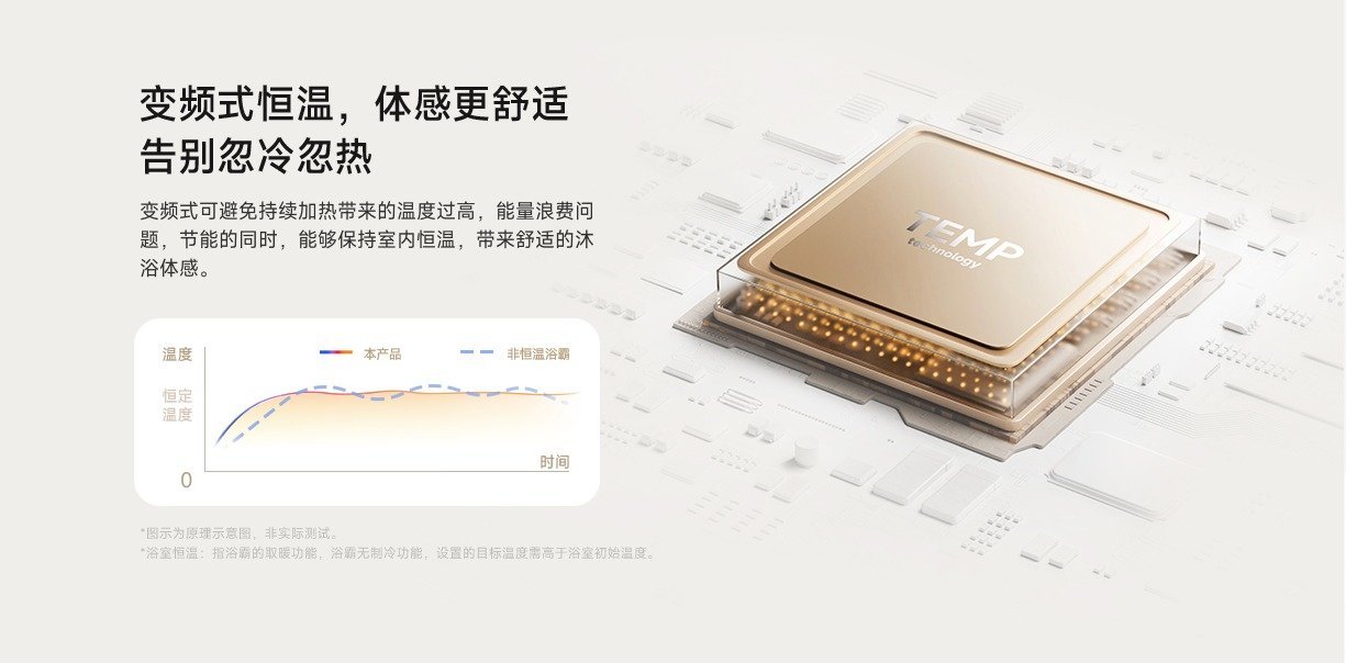 米家智能浴霸 N1 支持变频式恒温技术,可以有效避免在浴霸使用过程中持续加热导致的温度过高问题,同时节省能量。米家智能浴霸 N1 在保持节能的同时又能保持室内恒温,带来温暖舒适的沐浴体验。