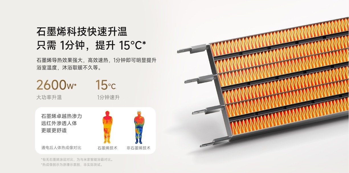 米家智能浴霸 N1 搭载石墨烯科技快速升温,最大升温功率可达 2600W ,1 分钟即可提升 15 度,带来高效的升温能力。米家智能浴霸 N1 还具备石墨烯卓越的热渗力,体感更温暖舒适。