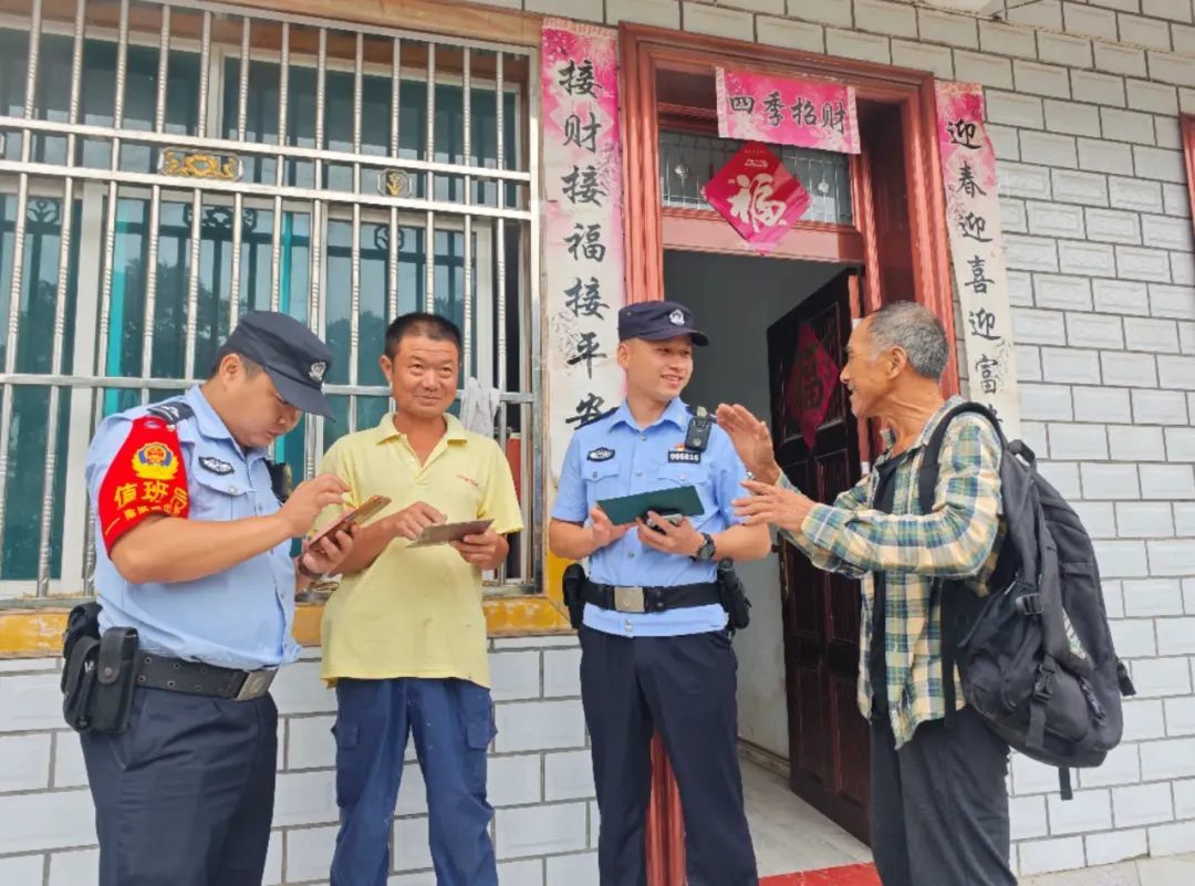 金寨县公安局南溪派出所所长龚书宏(右二)与辅警走访群众