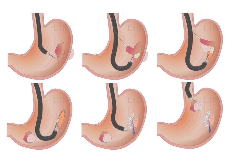图2 内镜下切除胃黏膜下肿瘤(感谢:林新林绘制插图)