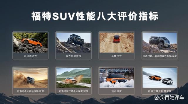 “全球SUV行家”福特深耕SUV领域80余年,拥有业界领先的SUV性能开发体系,根据不同程度户外用车需求打造“专注公路、轻度越野、中度越野、极限越野”四类SUV性能等级,并依据几何通过性、最大侧坡坡度、车辙尺寸等八大性能评价指标对SUV性能进行分类,为用户打造集可靠品质与卓越性能于一身的SUV。