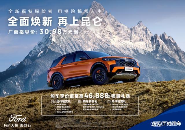 历经34年6代车型,福特探险者以不断的自我迭代回应着每一个时代的用车需求,以更纯粹的先锋精神与更硬核豪华的用车体验,唤醒每个人心中的探险者。全新福特探险者全面焕新而来,硬核豪华再进阶,将再刷新40万级硬核豪华SUV价值体验,以标杆级实力满足更多探险者“从都市到昆仑”全场景用车需求。用探险,犒赏人生。