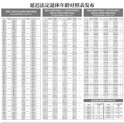 男职工和原法定退休年龄55周岁的女职工,每4个月延迟1个月;原法定退休年龄50周岁的女职工,每2个月延迟1个月。为了让公众更清楚看到自己未来什么时间退休,决定后附了延迟法定退休年龄对照表,可以根据自己的出生年月对照查询。