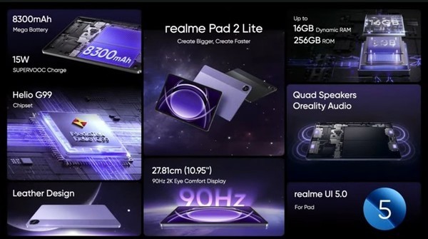 该平板联发科Helio G99处理器,该处理器的安兔兔得分为416497。搭配高达16GB RAM(8GB+8GB)和256GB ROM的内存组合。这款平板电脑运行基于Android 14的realme UI 5。