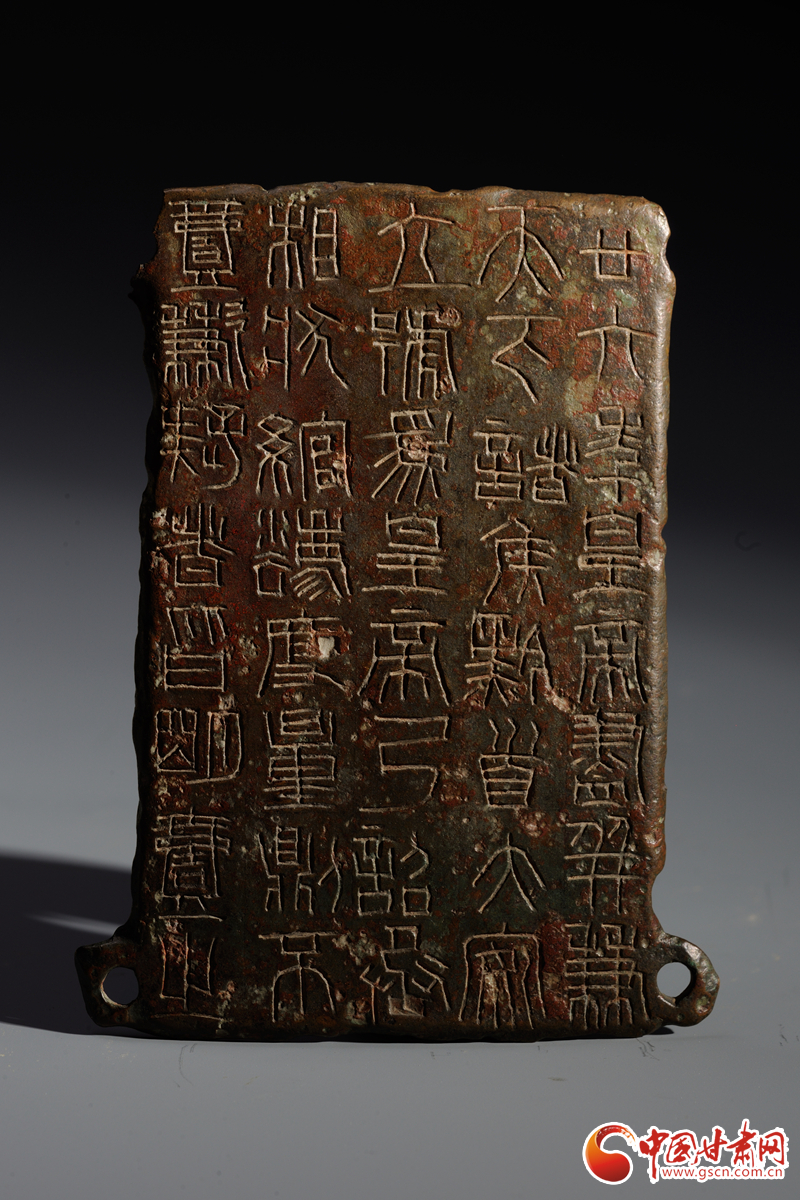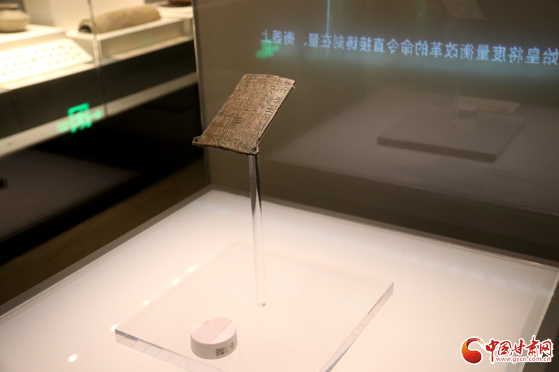 中国甘肃网9月14日讯(西北角·中国甘肃网记者 孙珩力)秦诏版,是指刻有秦始皇或秦二世统一度量衡诏书的铜版,有的镶在铁权、铜权上;有的四角有孔,用以钉在木头的量器上。目前我国出土的刻有秦始皇诏文的遗物有铜椭量、铜钱等,不仅数量多而且分布也广,而像这样把诏文刻在铜版上的诏版形式在全国极为罕见,镇原县博物馆收藏的就是其中之一,可谓稀世珍品。
