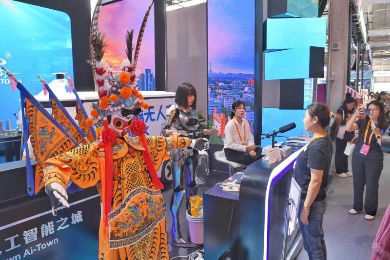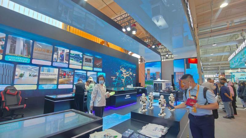 走进展位,北京青年报记者看到EX机器人、京剧机器人、无人售卖车,AR字幕眼镜、“人工智能+教育”机器人、无人机等近十款来自北京亦庄的明星产品陈列整齐,超清LED屏幕气势恢宏贯通展位,一条“数字凉水河”缓缓流淌在脚下,动态显示着粼粼波光的流水,水畔栖息的麋鹿与水鸟清晰可见,让人仿佛置身其中,“科技范”十足。