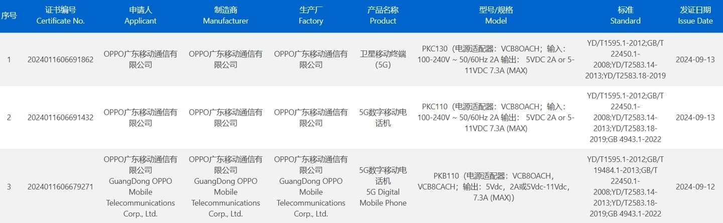 9 月 14 日消息,型号为 PKB110、PKC110、PKC130 的三款 OPPO 新机于 9 月 12 日和 9 月 13 日陆续通过 3C 认证,均支持 80W 快充,其中 PKC130 为卫星移动终端(5G)。