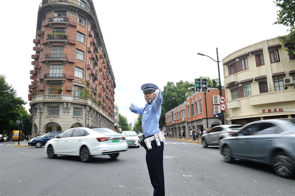 图说:徐汇公安分局民警在武康大楼附近疏导交通