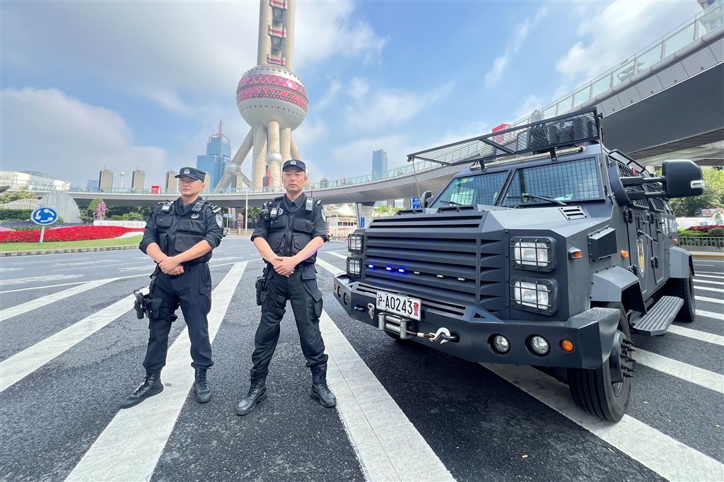 图说:浦东公安分局特警支队民警在陆家嘴东方明珠环岛附近开展路面执勤(上海警方供图,同下)