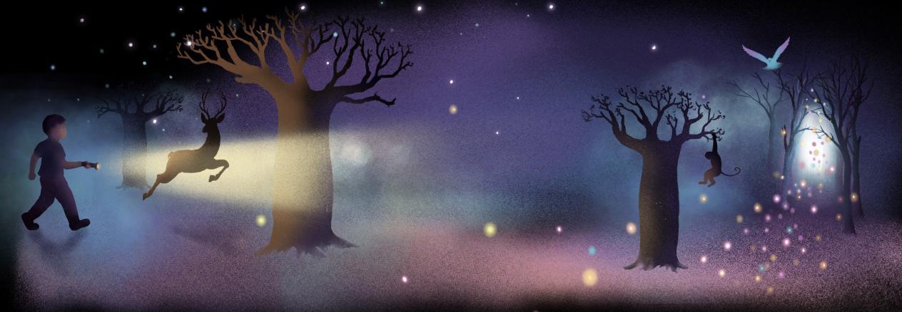 艺术家黄赛峰携手DIGIARTING共同创作的《幻境奇旅》,是一个关于“我和我自己”跨时空共同成长的奇幻故事。作品讲述了小男孩无意间打开一个时光宝盒,开启一段时光之旅,在此过程中遇见了他的好友:穿越光年化身为鹿先生的长大后的自己。他们深入幻境,探寻未知,共同前行,最终在鹿先生的护佑下迎接奔赴属于他的世界。整个作品在画风上借鉴了中国皮影戏的艺术样式、采用了剪影式的绘画风格,给人以静谧感,色彩上又营造出一种奇幻、跨时空的错觉,犹如入夜后独自在台灯下潜心夜读,却心渡天涯。作品中的浦江场景与外萃丰弄“浦江夜画”的主题形成互文,无具体面貌的人物形象能使观者更具代入感,能在不经意间引起情感共鸣,作品的动画部分则借助AI技术实现。