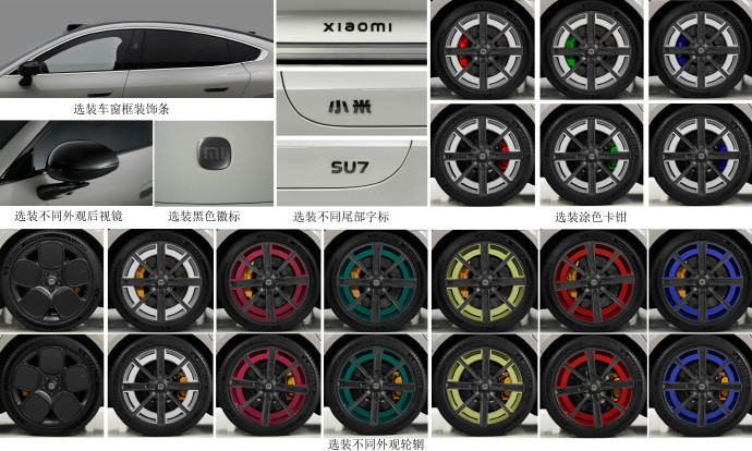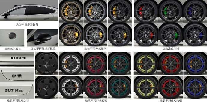 ZAKER科技9月14日消息,昨日工信部发布了第 387 批《道路机动车辆生产企业及产品公告》变更扩展公示,小米 SU7 增加了多种选装,包含了小米SU7(含Pro版)与小米SU7 Max的后视镜外壳颜色、轮辋样式、卡钳涂装,甚至车窗装饰条、尾部字标与品牌徽标等,几乎涵盖了常规车辆改装、美容的项目。