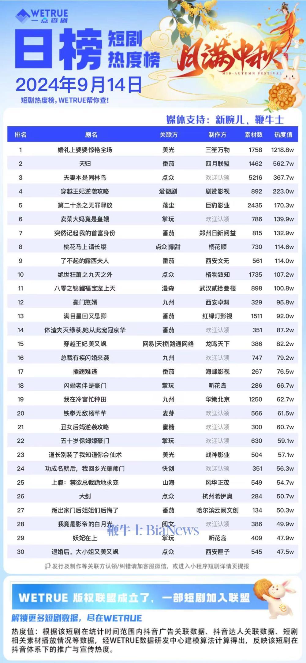 编者按:为帮助短剧从业者提供更多信息,专注于短剧报道的新腕儿和科技媒体鞭牛士联合WETRUE短剧热度榜共同推出短剧热度榜。