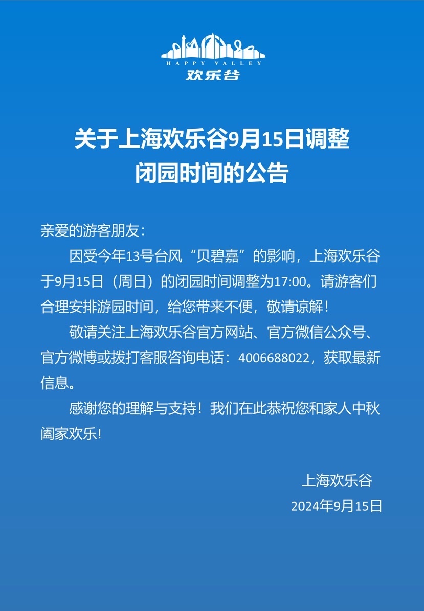 因受今年13号台风“贝碧嘉”的影响,上海欢乐谷于9月15日(周日)的闭园时间调整为17:00。请游客们合理安排游园时间,给您带来不便,敬请谅解!
