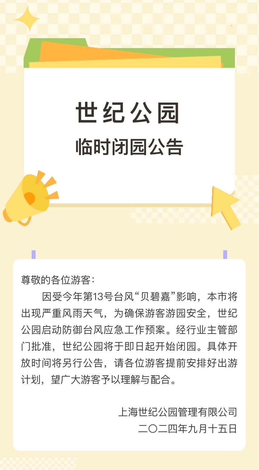 因受今年第13号台风“贝碧嘉”影响,本市将出现严重风雨天气,为确保游客游园安全,世纪公园启动防御台风应急工作预案。经行业主管部门批准,世纪公园将于即日起开始闭园。具体开放时间将另行公告,请各位游客提前安排好出游计划,望广大游客予以理解与配合。