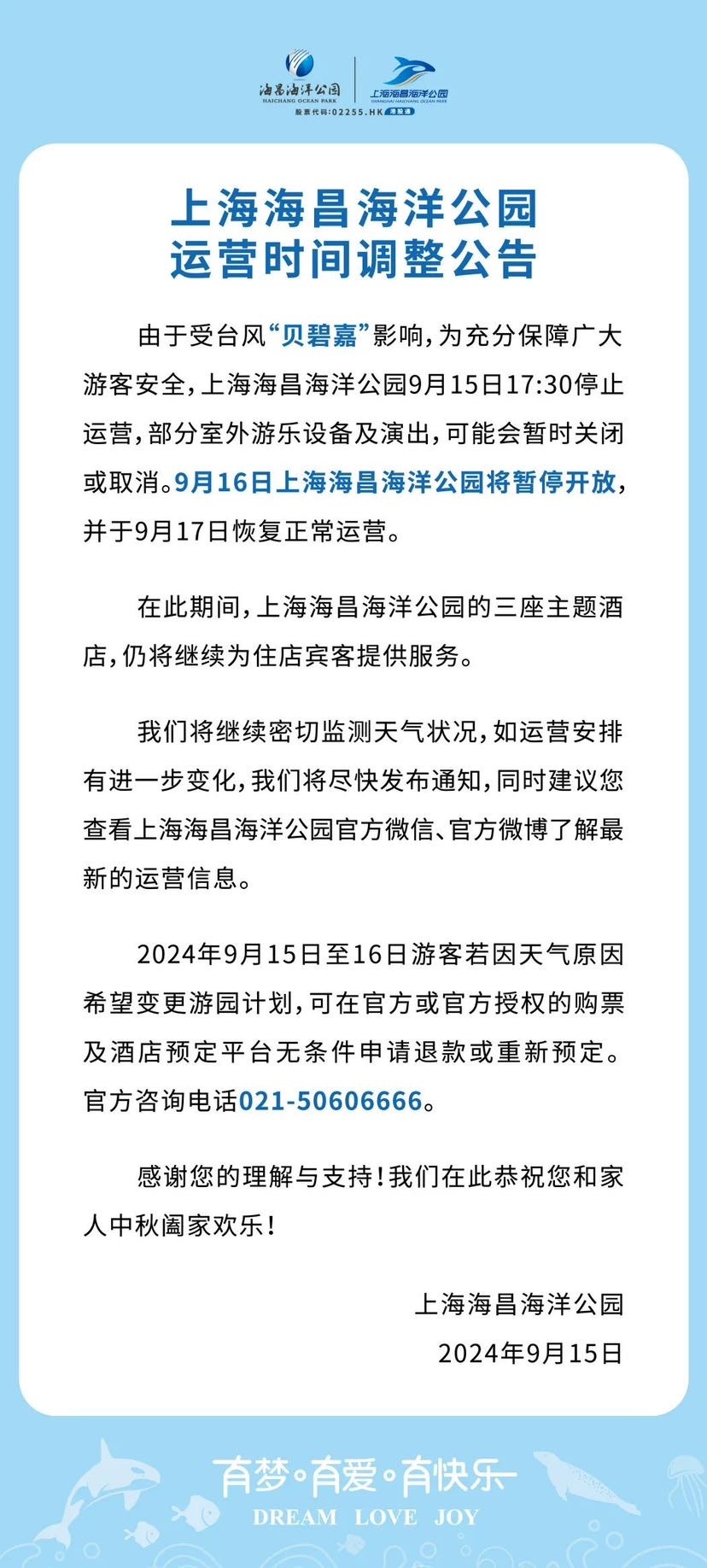 由于受台风“贝碧嘉”影响,为充分保障广大游客安全,上海海昌海洋公园9月15日17:30停止运营,部分室外游乐设备及演出,可能会暂时关闭或取消。9月16日上海海昌海洋公园将暂停开放,并于9月17日恢复正常运营。