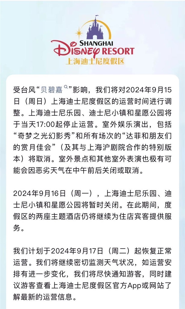 上海迪士尼度假区发布公告称,受台风影响,对9月15日(周日)上海迪士尼度假区的运营时间进行调整。上海迪士尼乐园、迪士尼小镇和星愿公园于当天17:00起停止运营。室外娱乐演出,包括“奇梦之光幻影秀”和所有场次的“达菲和朋友们的赏月佳会”(及其与上海沪剧院合作的特别版本)取消。室外景点和其他室外表演也极有可能会因恶劣天气在中午前后关闭或取消。
