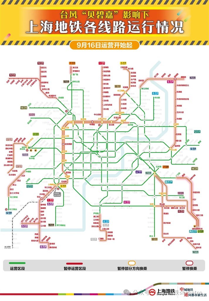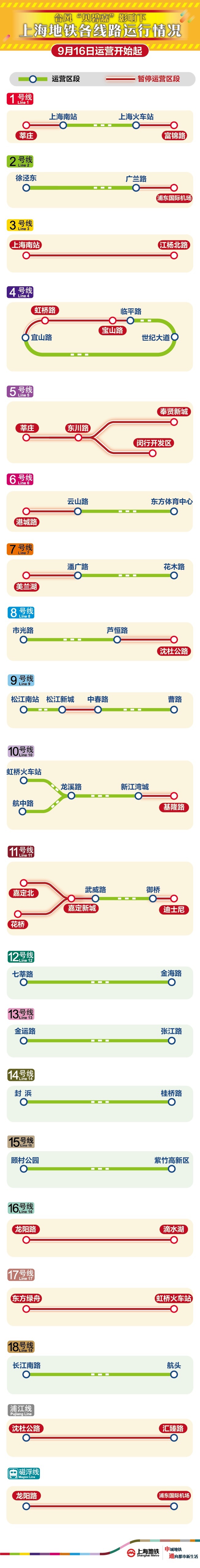 明天(9月16日)自运营开始时起,3号线、5号线、16号线、17号线、浦江线、磁浮线全线停运;1号线、2号线、4号线、6号线、7号线、8号线、9号线、10号线、11号线的地面、高架段停运。