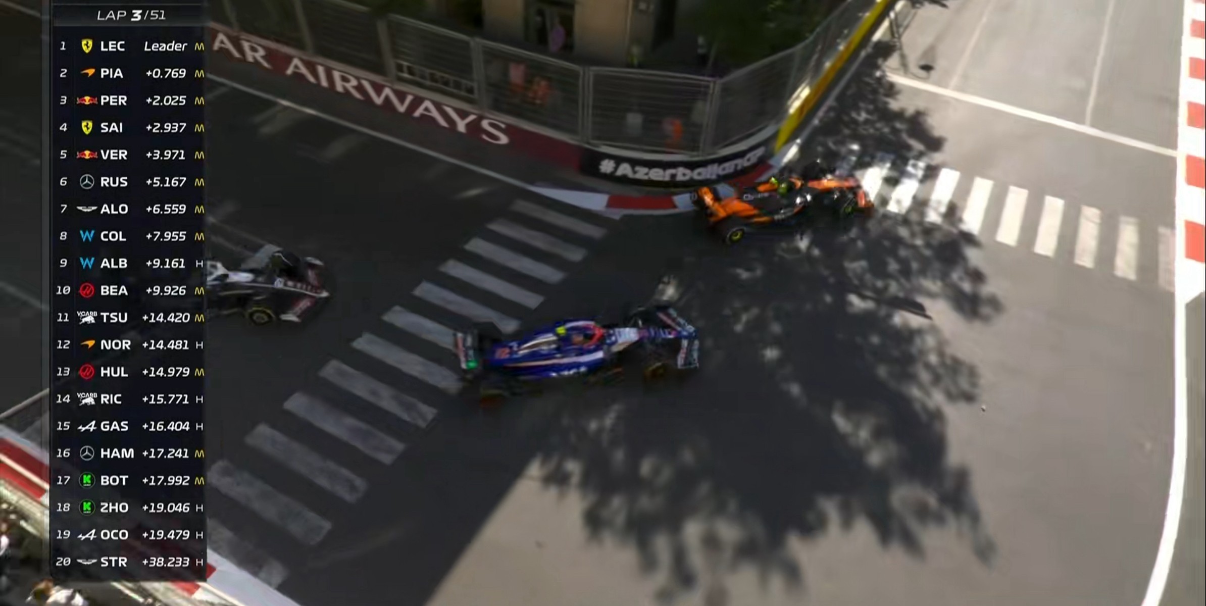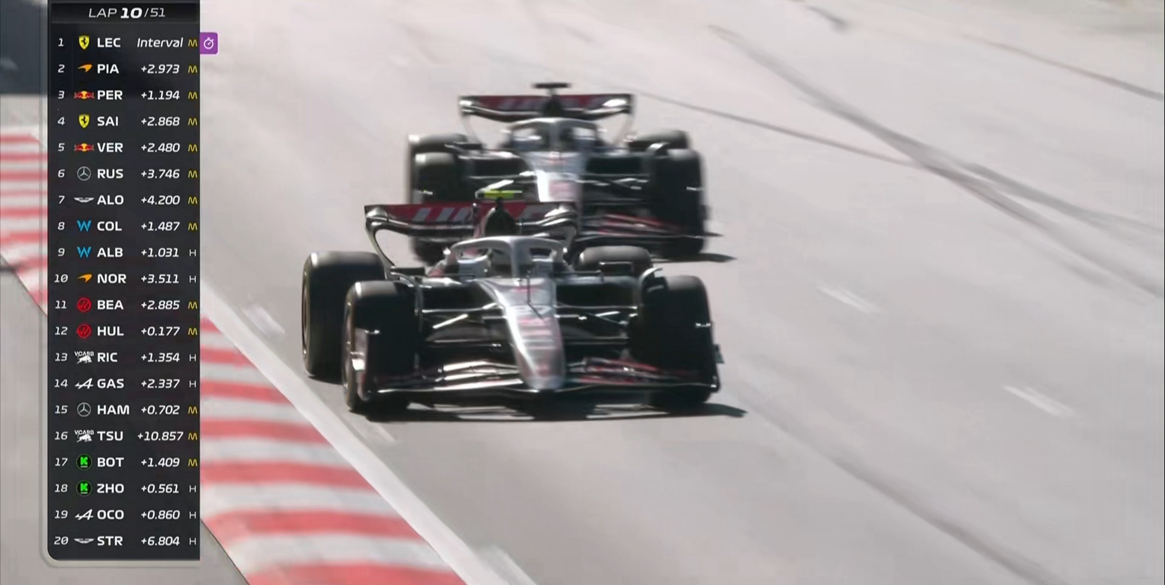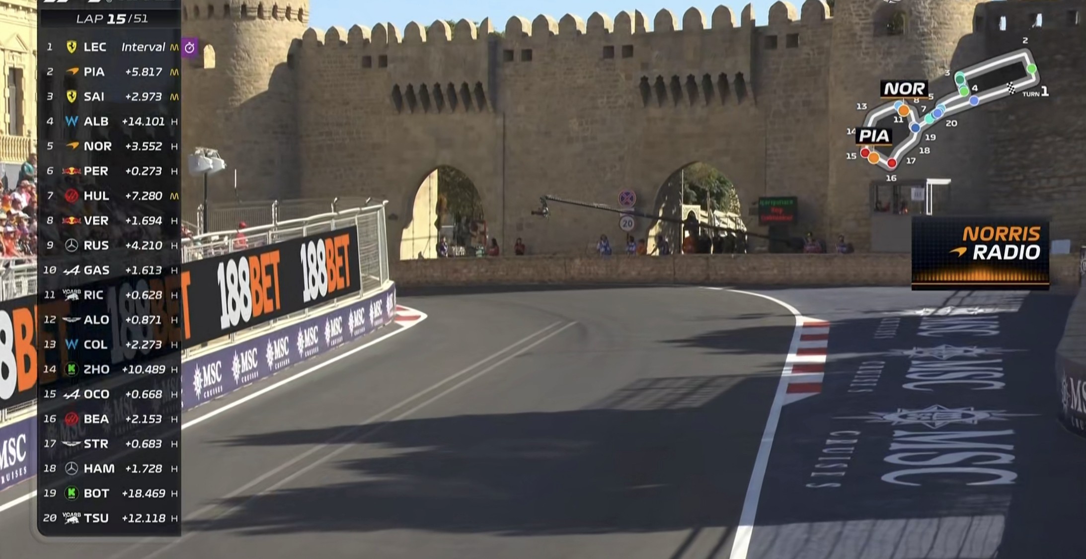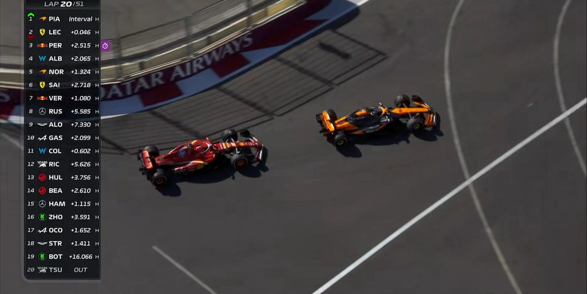 第20圈:皮亚斯特里在1号弯晚刹车强硬超越勒克莱尔,迈凯伦开始领跑比赛!