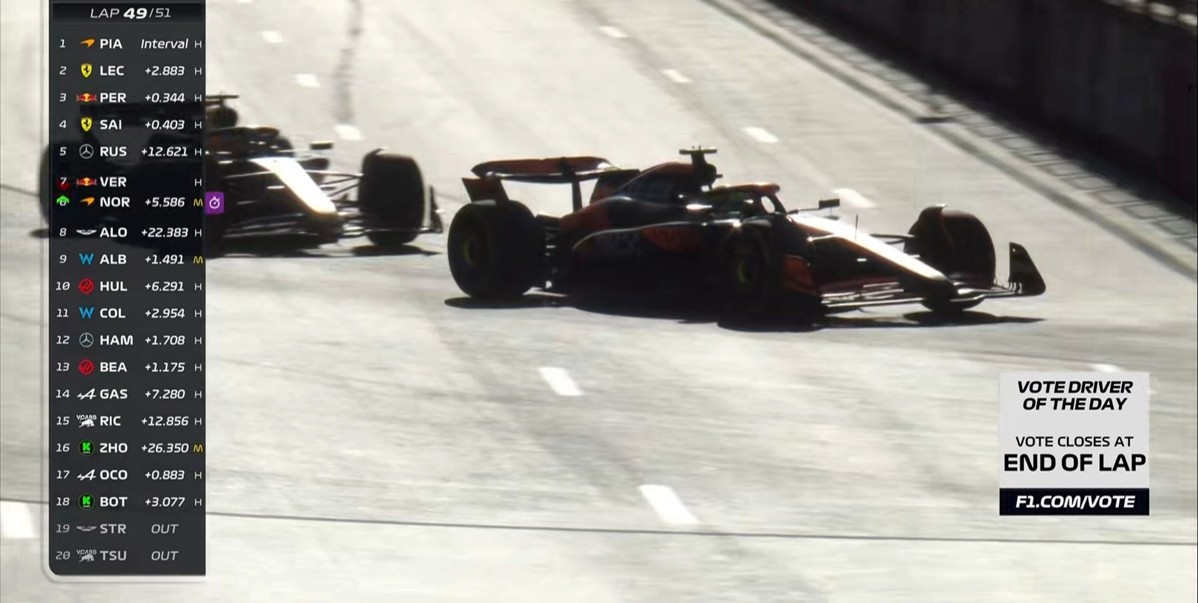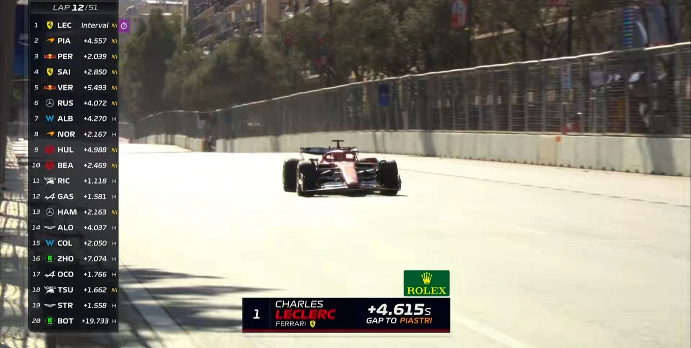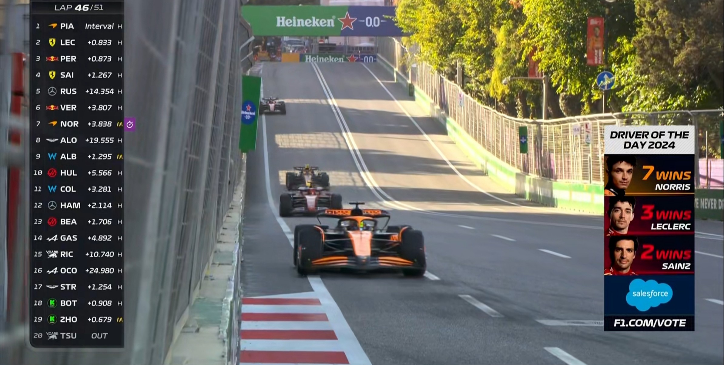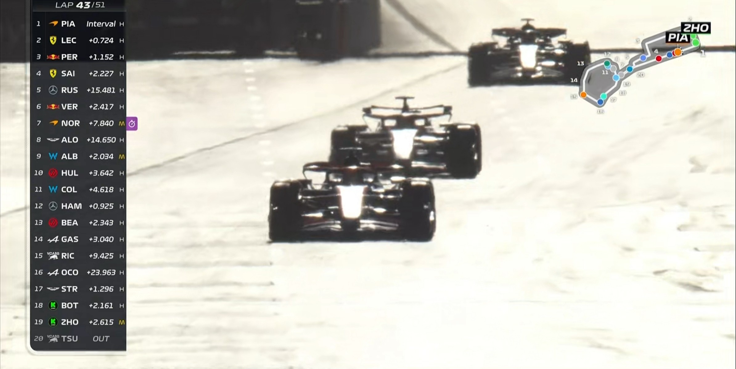 第48圈:皮亚斯特里拉开勒克莱尔至2.3秒,诺里斯追近至维斯塔潘的DRS区间!