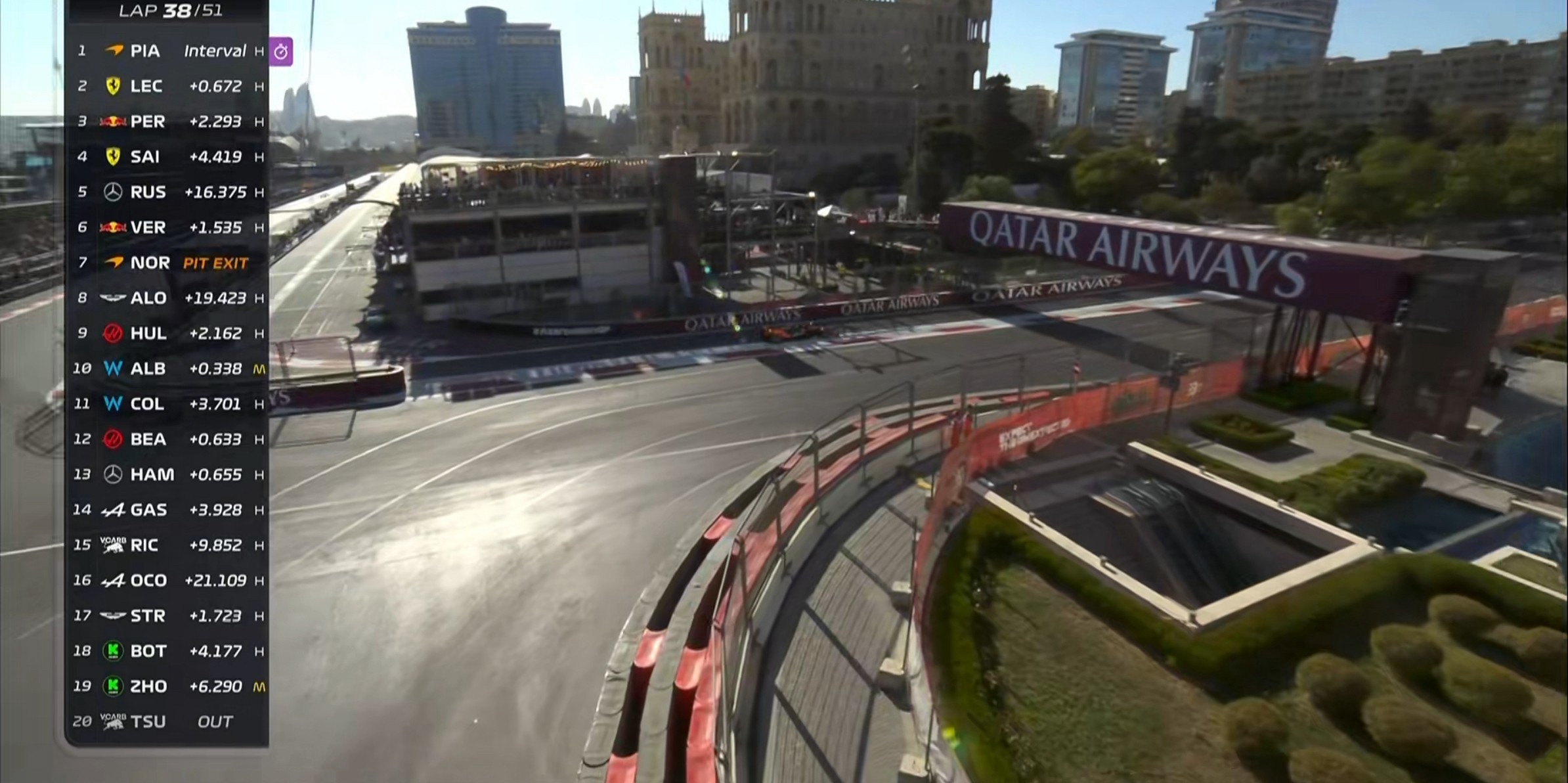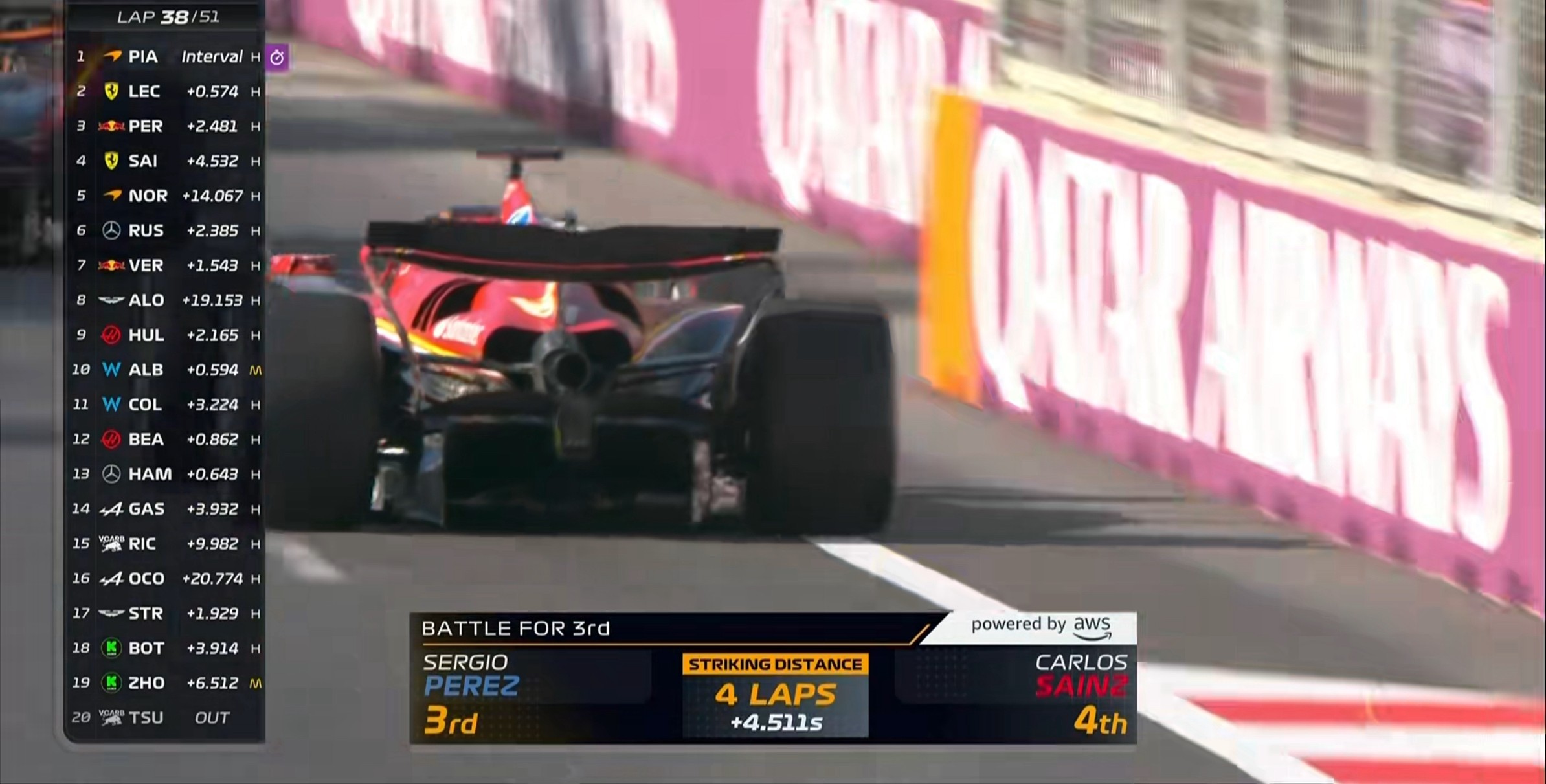 第38圈:皮亚斯特里依旧领跑,佩雷兹已经落后勒克莱尔2秒!