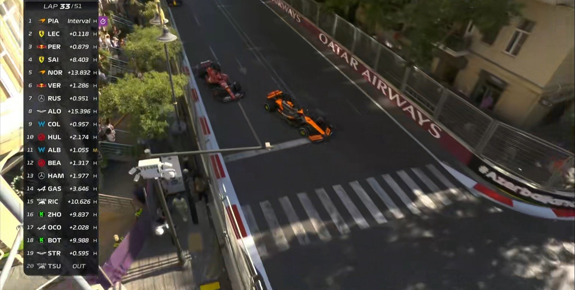 第33圈:皮亚斯特里强硬防守勒克莱尔,佩雷兹重新追击到勒克莱尔的DRS区间!