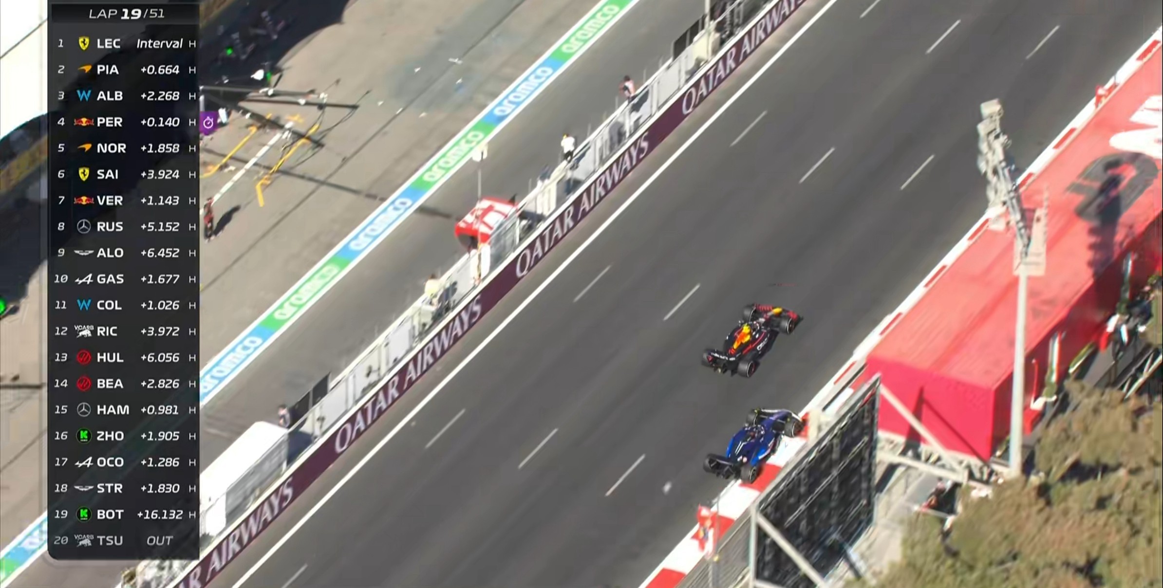 第19圈:佩雷兹在浪费了一些时间后,在直道利用DRS超越未进站的阿尔本!