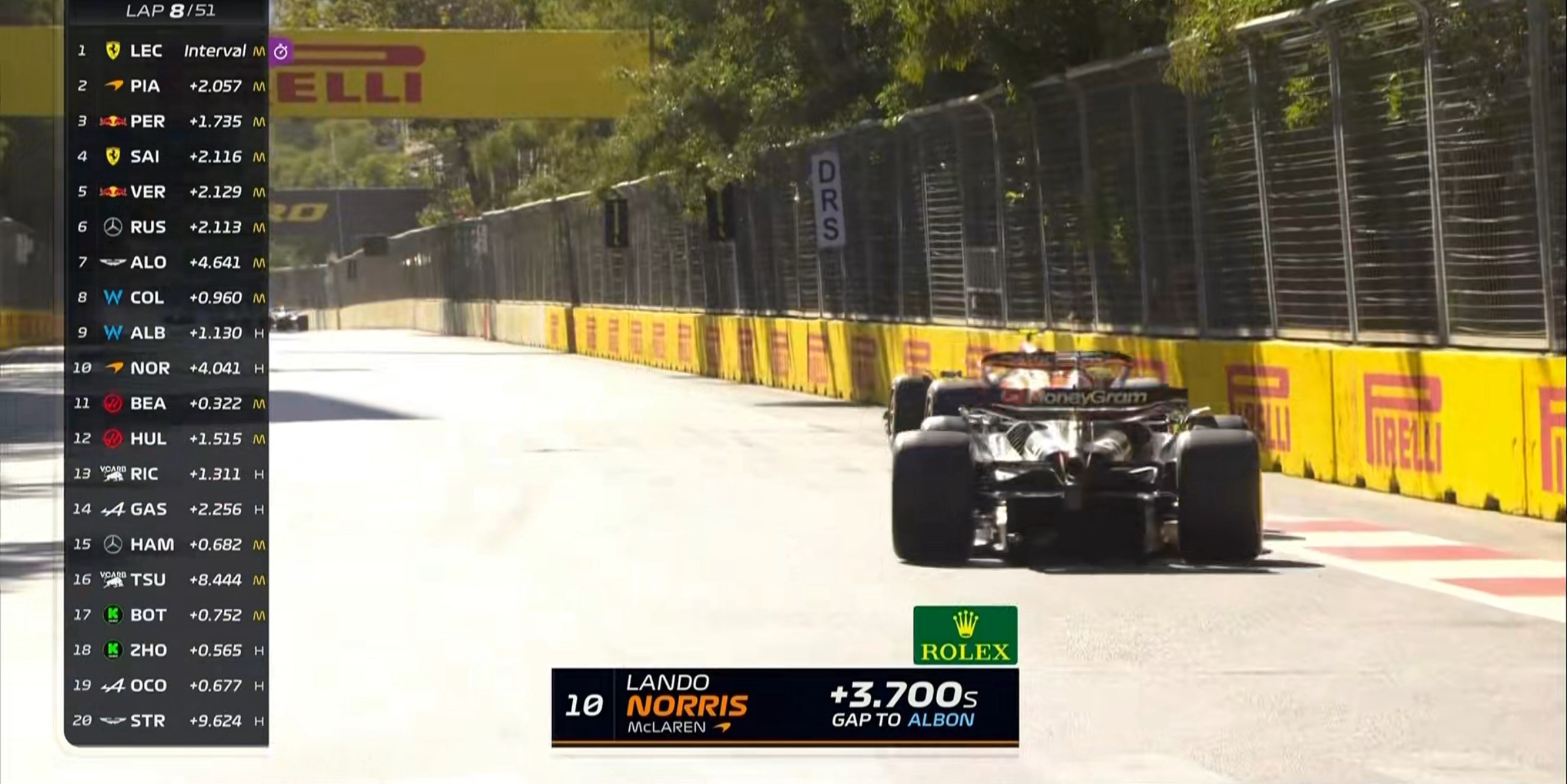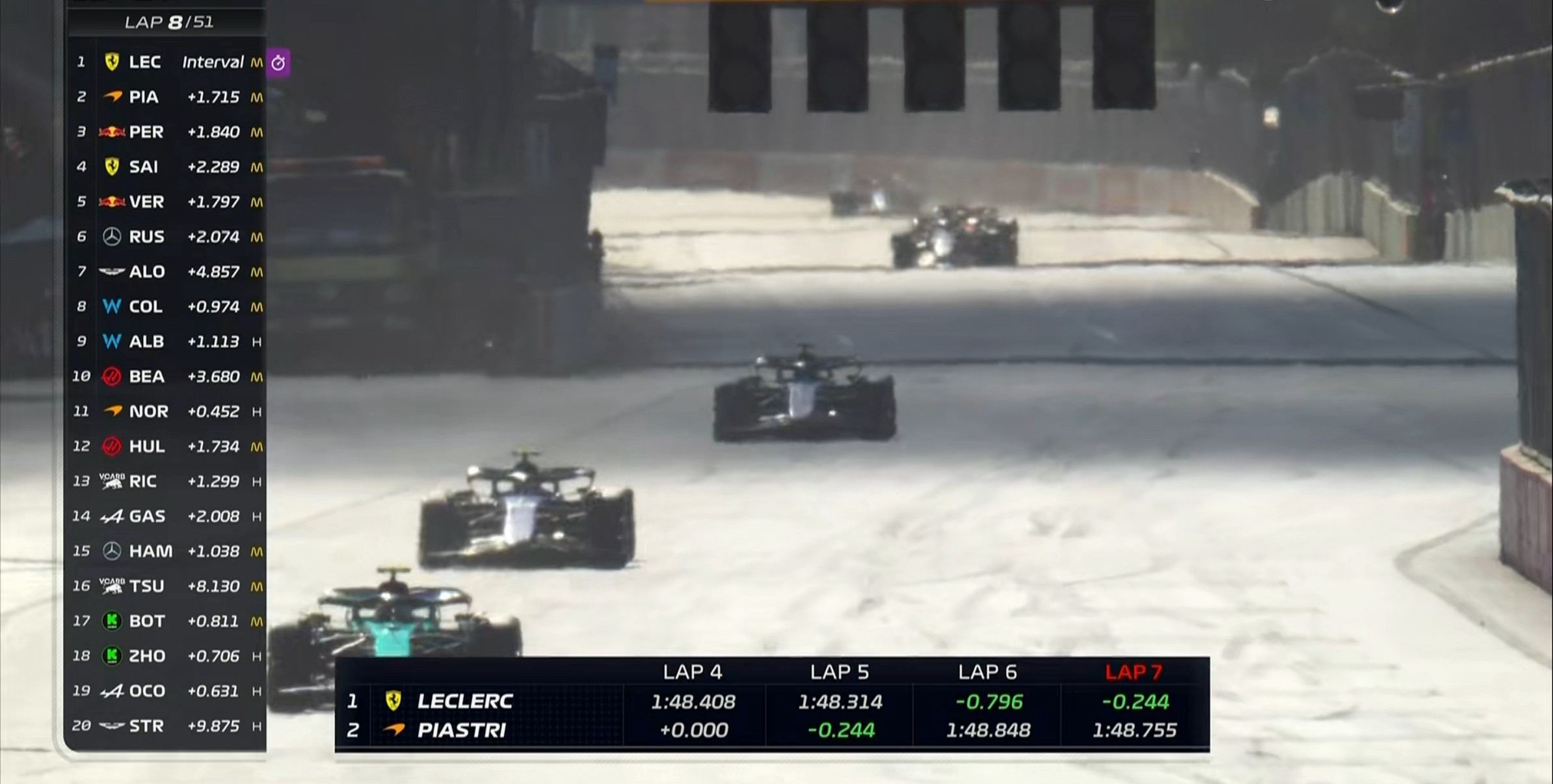 第8圈:勒克莱尔与皮亚斯特里的差距被扩大至1.7秒,勒克莱尔的圈速占优!